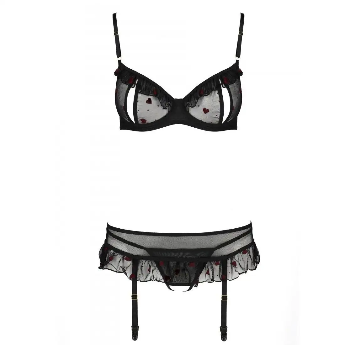 Бюстгальтер имеет чашечки на косточках с регулируемыми бретельками для индивидуальной посадки. Пояс для чулок также имеет регулируемые лямки, что позволяет подобрать идеальную длину чулок. А стринги завершают образ своим сексуальным кроем и удобным дизайном.