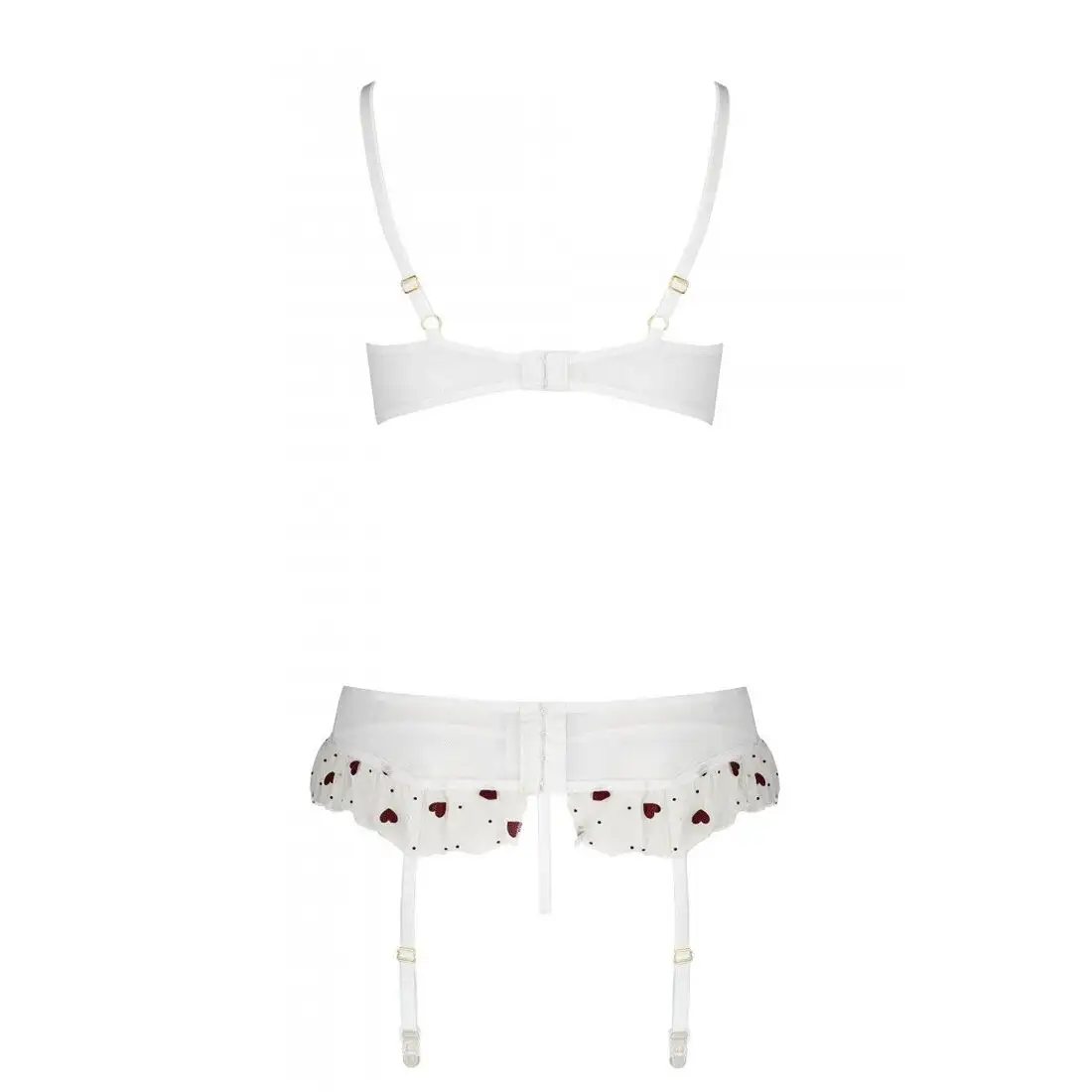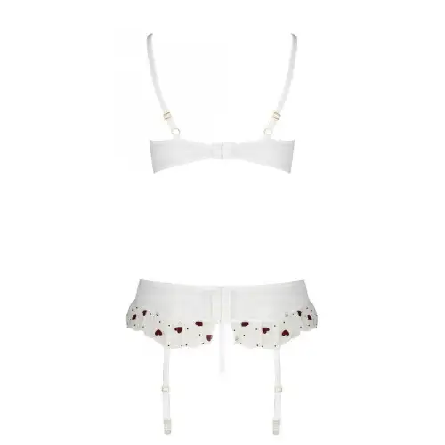 Бюстгальтер имеет чашки на косточках с тонкой отделкой из кружева и регулируемые бретели для индивидуальной посадки. Пояс для чулок также может похвастаться замысловатыми кружевными акцентами и регулируемыми ремнями, обеспечивающими идеальную посадку. Соответствующие стринги завершают образ своим сексуальным дизайном.