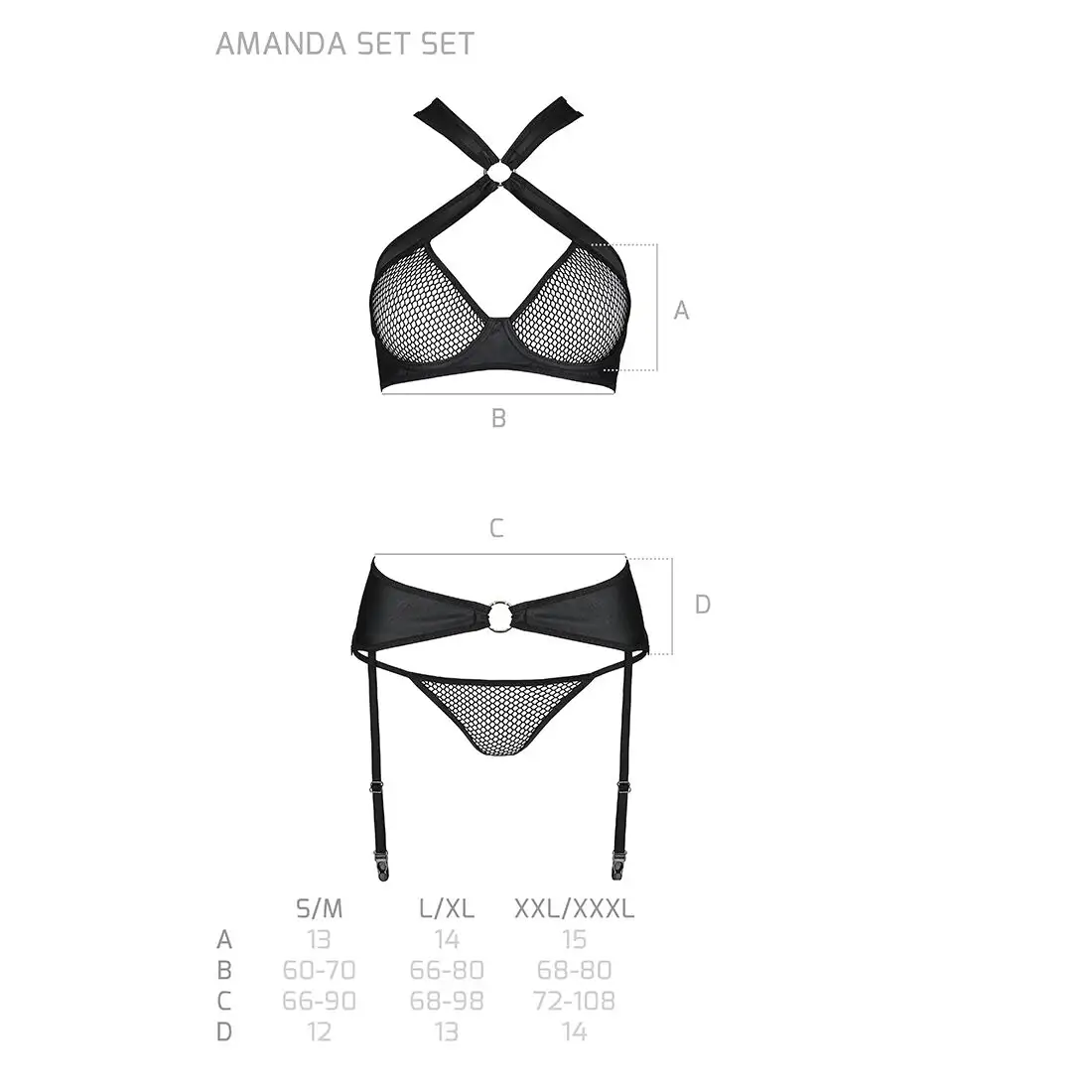Сетчатый набор: бюстгальтер с халтером, трусики и пояс для чулок Amanda Set black L/XL - Passion