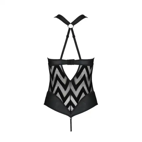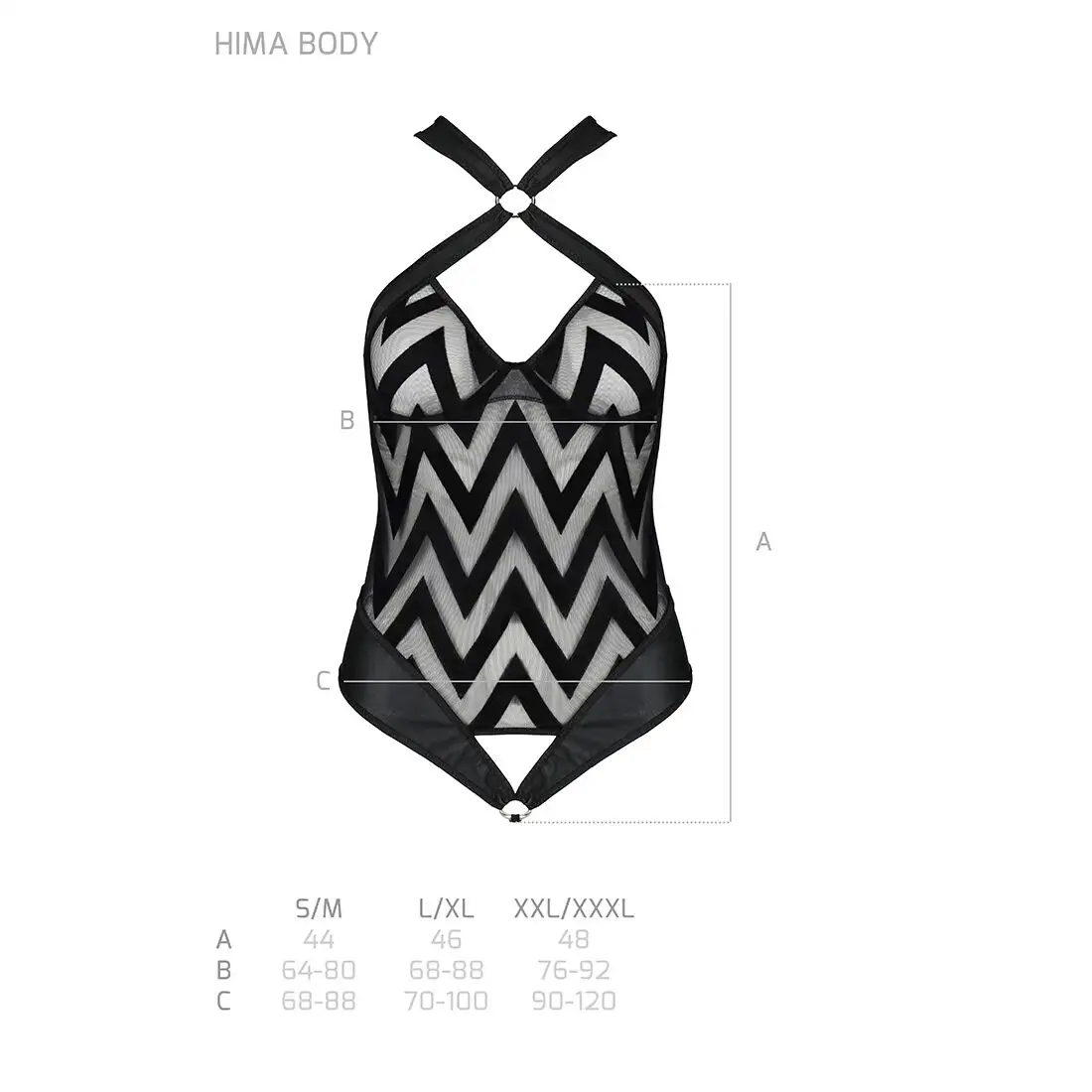 Hima Body black XXL/XXXL - Passion, потрясающее сетчатое боди с бретелькой на шее и ритмичным рисунком, в котором вы будете чувствовать себя сексуально и уверенно. Эта вещь идеально подходит для тех, кто хочет добавить изюминку в свою коллекцию нижнего белья, или для тех, кто ищет что-то особенное для романтической ночи.