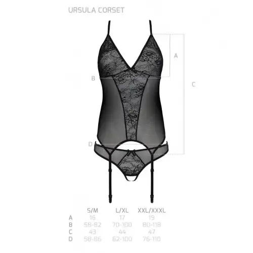 Черный корсет Passion Ursula станет прекрасным дополнением к вашей коллекции нижнего белья. Этот потрясающий корсет доступен в размере S/M и имеет бретельки для чулок, а также кружевные трусики с открытой промежностью. Замысловатые кружевные детали на корсете и трусиках добавляют нотку элегантности и чувственности этому и без того соблазнительному изделию.