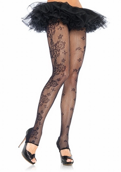 Черные колготки в мелкую сеточку с флористическим узором. Состав: 85% нейлон, 15% спандекс. Прекрасно тянуться, но при этом плотно сидят на ножке. Размер OS, подходит для параметров: объем бедер - 86-102 см, объем талии - 61- 82 см, длина по внутреннему шву - 89 см, вес - 41-73 кг.