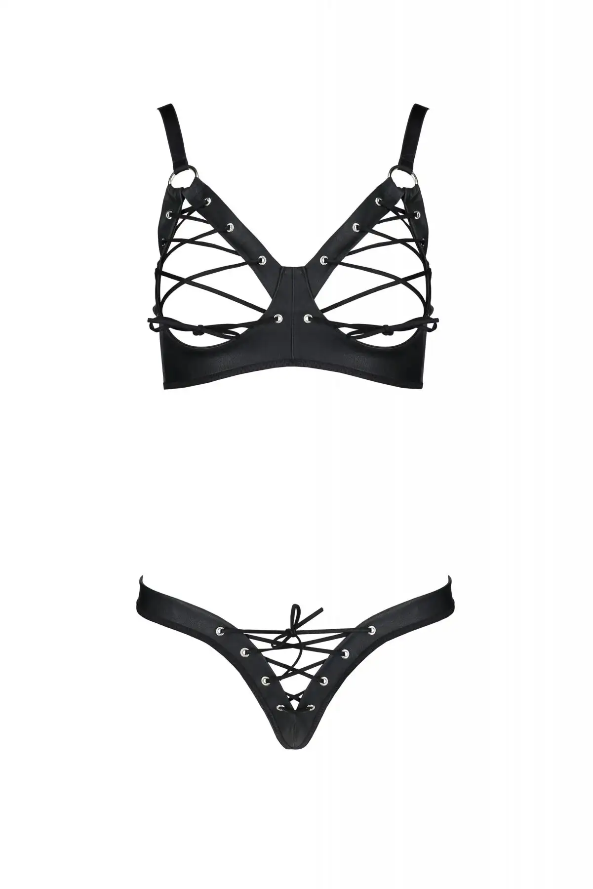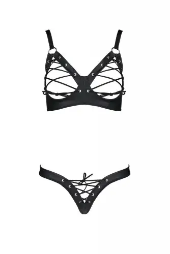 Комплект из экокожи Passion Celine Bikini 6XL/7XL black, открытый бра, стринги со шнуровкой