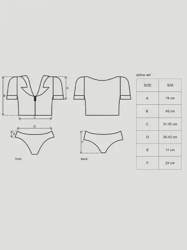 Набор Obsessive Police S/M выпускается в различных размерах, подходящих для любого типа телосложения. Будь вы миниатюрной или фигуристой, в этом костюме вы будете чувствовать себя уверенно и сексуально. За ним также легко ухаживать - просто постирайте его вручную в холодной воде и повесьте сушиться.