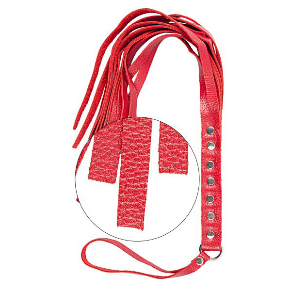Флогер S&M Fancy Leather Floger, красный – это плеть с 12 хвостами, выполнена из натуральной телячьей кожи и декорирована металлическими заклепками. Данная модель флогера, относится к мягким видам прелюдии, поэтому ее могут использовать не только опытные пользователи, но и новички.