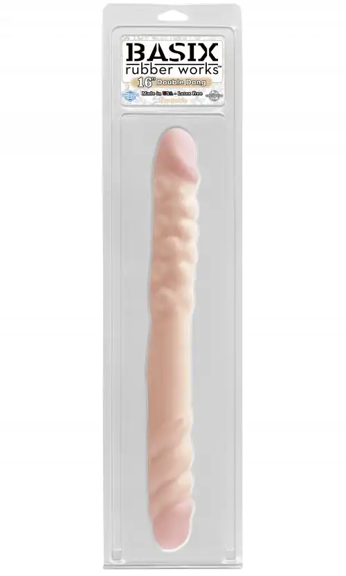 Двойной фаллоимитатор BASIX 16 DOUBLE DONG. Очень реалистично сделанный фаллос, имеет рельефную поверхность для чувственной стимуляции. Мягкий и приятный на ощупь, гнется. Длина – 40,6 см, диаметр – 4,4 см. Отлично подходит для одновременной стимуляции 2-х человек.