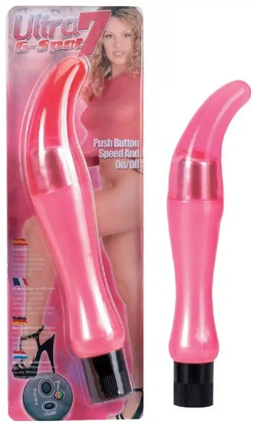 Гелевый вибратор ULTRA 7 G-SPOT. Имеет 7 режимов вибрации. Его форма специально создана для стимуляции точки-G у женщин. Длина - 19 см, ширина - от 2,5 см до 4 см.