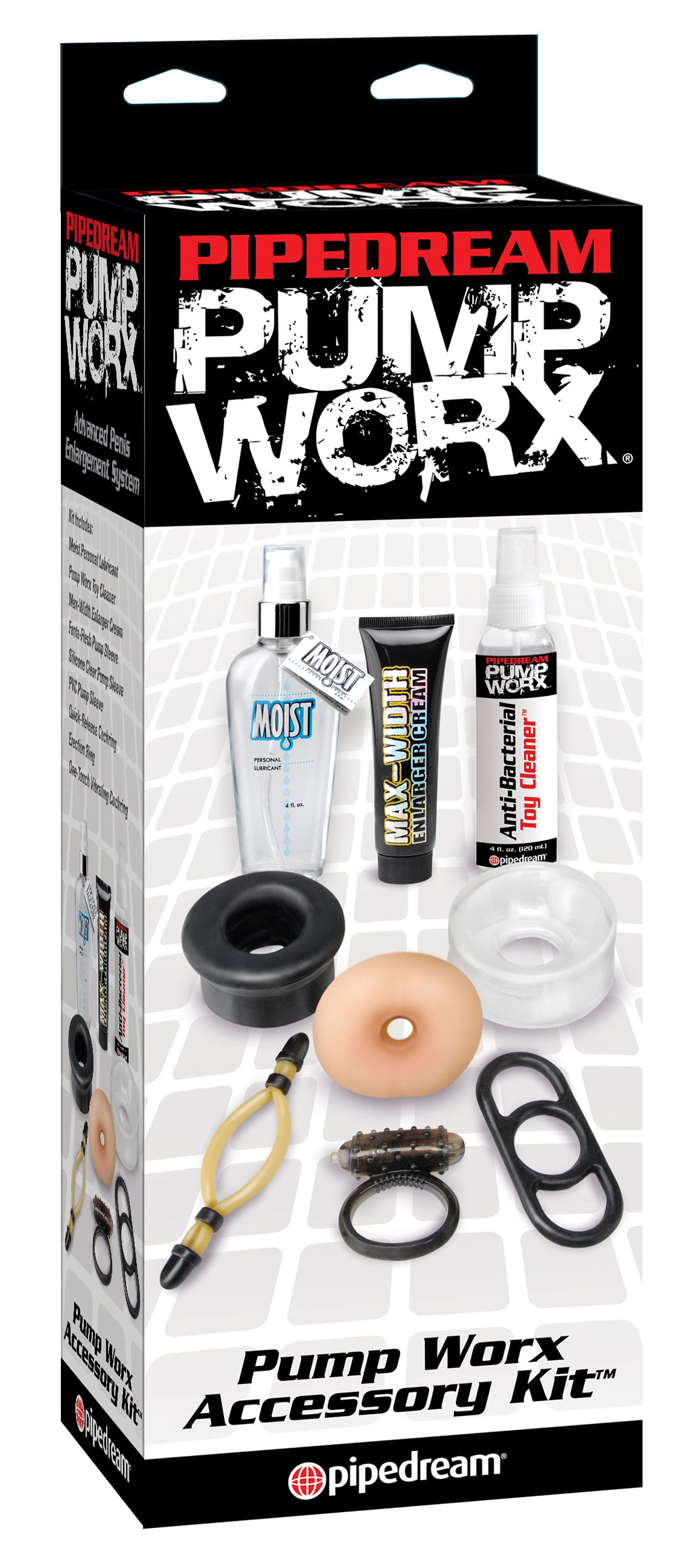 КОМПЛЕКТ АКСЕССУАРОВ PUMP WORX — идеальное дополнение к вашей коллекции секс-игрушек. Этот комплект включает в себя все, что вам нужно, чтобы улучшить ваш сексуальный опыт и увеличить размер вашего полового члена. В комплект входят 20 мл смазки, 20 мл чистящего средства для секс-игрушек, 44 г крема для увеличения, три уплотнения вакуумного насоса и три эрекционных кольца (одно из которых имеет вибрирующий модуль).