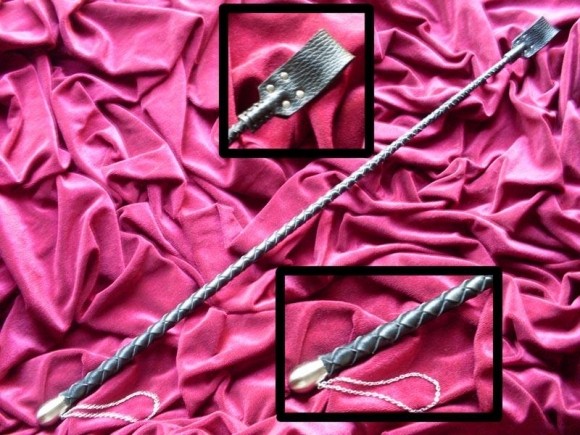 Стек силиконовый. С одной стороны кожаный "хлопок" на четырех заклепках, а с другой стороны никелированная ручка. Внутри гибкий силиконовый стержень, оплетенный кожей. Общая длина - 67 см. Вес - около 250 гр.