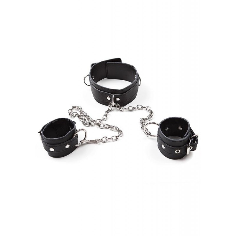Кожаный ошейник с наручниками на цепи. Материал - натуральная кожа, металл. Размер - универсальный, регулируется.